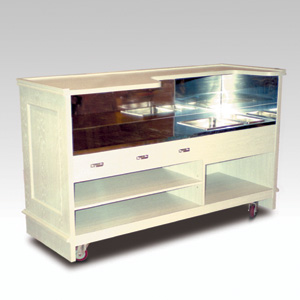・サイズ:W1800×D650×H1100mm ・キャスターサイズ:100φ 自在キャスター4輪 ・本体:ナラ材塗装 ・天板:メラミン化粧板 ・内部:ステレス ・シンク2個付 ・販売価格:\504,400 (消費税は別途)