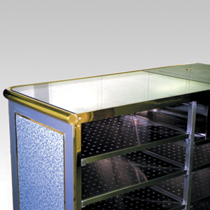・サイズ:W1500×D680×H1100mm ・キャスターサイズ:100φ 自在キャスター4輪 ・本体:合板ダイノック張り 真鍮飾り/ステンレス ・販売価格:\878,000 (消費税は別途)