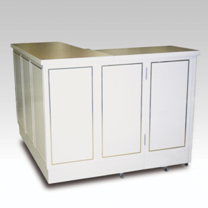 ・折りたたみ式 ・サイズ:W1600×D1400×H1100mm ・キャスターサイズ:100φ 自在キャスター5輪 ・キャスターサイズ:65φ 自在キャスター3輪 ・本体:サクラ材塗装 真鍮モール付 ・天板:メラミン化粧板 ・販売価格:\507,000 (消費税は別途)