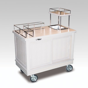 ・サイズ:W900×D600×H1050mm ・キャスターサイズ:125φ 自在キャスター4輪 ・本体:ナラ材塗装 ・天板:メラミン化粧板 ・アイスシンク付 ・引き違い戸 ・販売価格:\442,000 (消費税は別途)