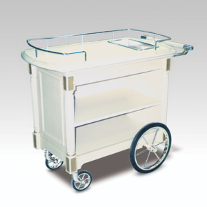 ・サイズ:W1000×D580×H870mm ・キャスターサイズ:350φ 固定キャスター2輪 ・キャスターサイズ:130φ 自在キャスター2輪 ・本体:サクラ材塗装 ・天板:メラミン化粧板 ・ランカン ・アイスペール付 ・販売価格:\507,000 (消費税は別途)