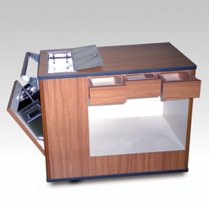 ・サイズ:W965×D570×H900mm ・キャスターサイズ:130φ 自在キャスター2輪 固定キャスター2輪 ・本体:メラミン化粧板 ・ステンレスボックス付 ・販売価格:\422,500 (消費税は別途)