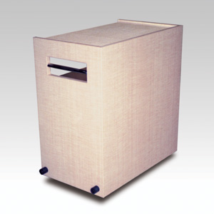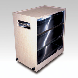 ・サイズ:W980×D530×H930mm ・キャスターサイズ:130φ ・自在キャスター2輪 ・固定キャスター2輪 ・本体:合板ダイノックシート張り ・内部:ステンレス張り ・販売価格:\390,000 (消費税は別途)
