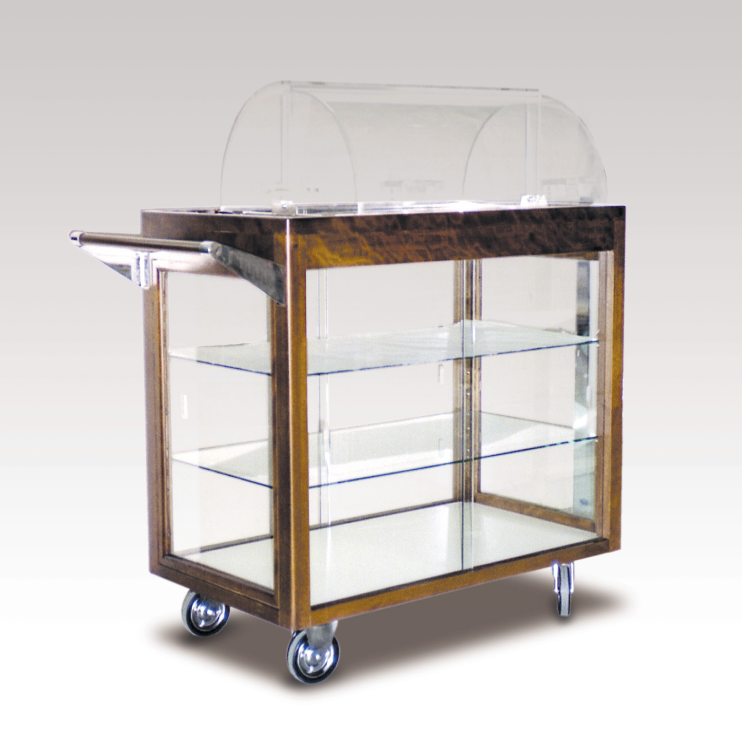 ・サイズ:W900×D460×H1000mm ・キャスターサイズ:100φ 自在キャスター4輪 ・本体:サクラ材塗装 ・アクリルフード付 ・ガラス棚付 ・販売価格:\384,000 (消費税は別途)