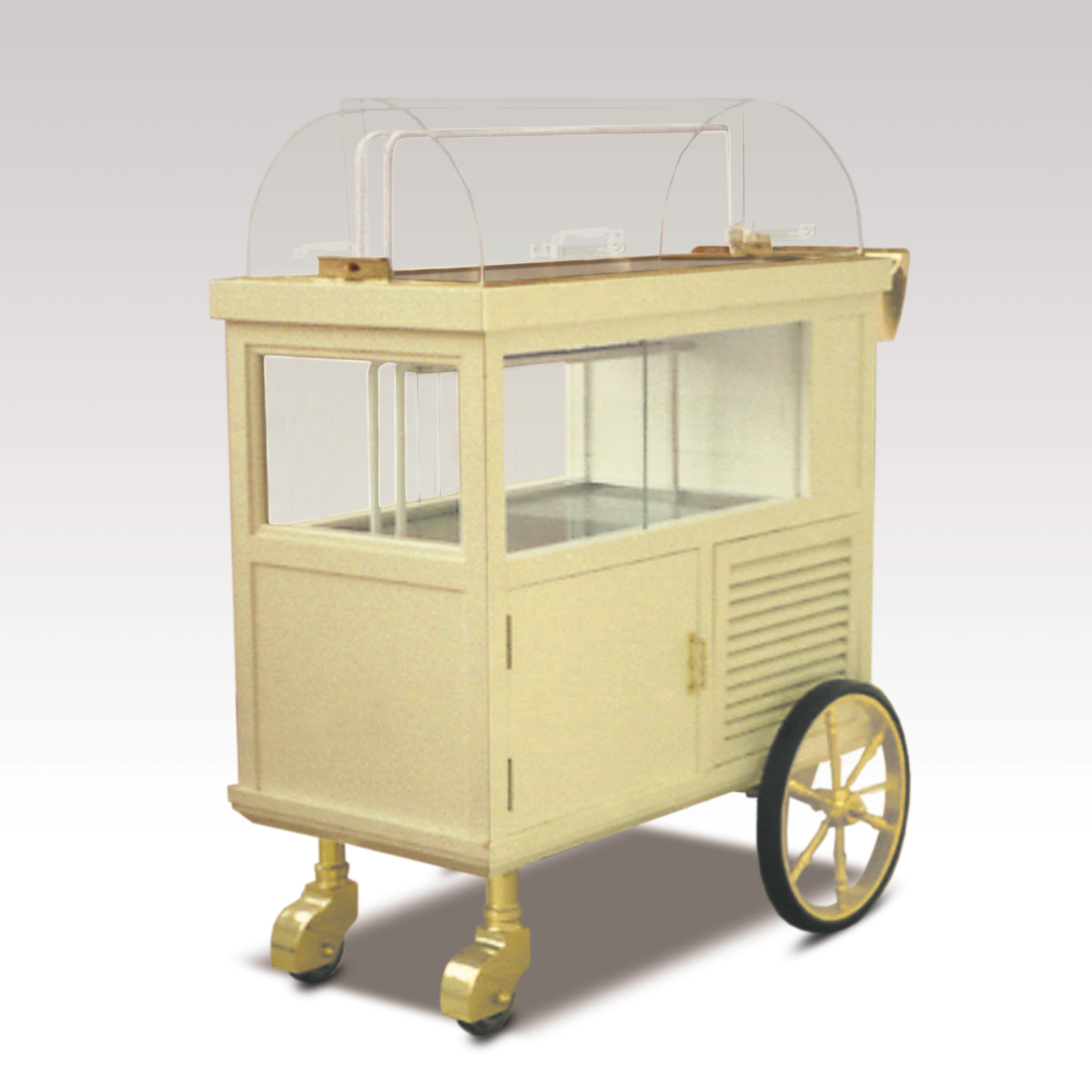 ・サイズ:W960×D550×H1120mm ・キャスターサイズ:350φ 固定キャスター2輪 ・キャスターサイズ:100φ カバー付きゴールドメッキ 自在キャスター2輪 ・本体:サクラ材塗装 ・アクリルフード ・ステンレスシンク付 ・販売価格:\1,300,000 (消費税は別途)