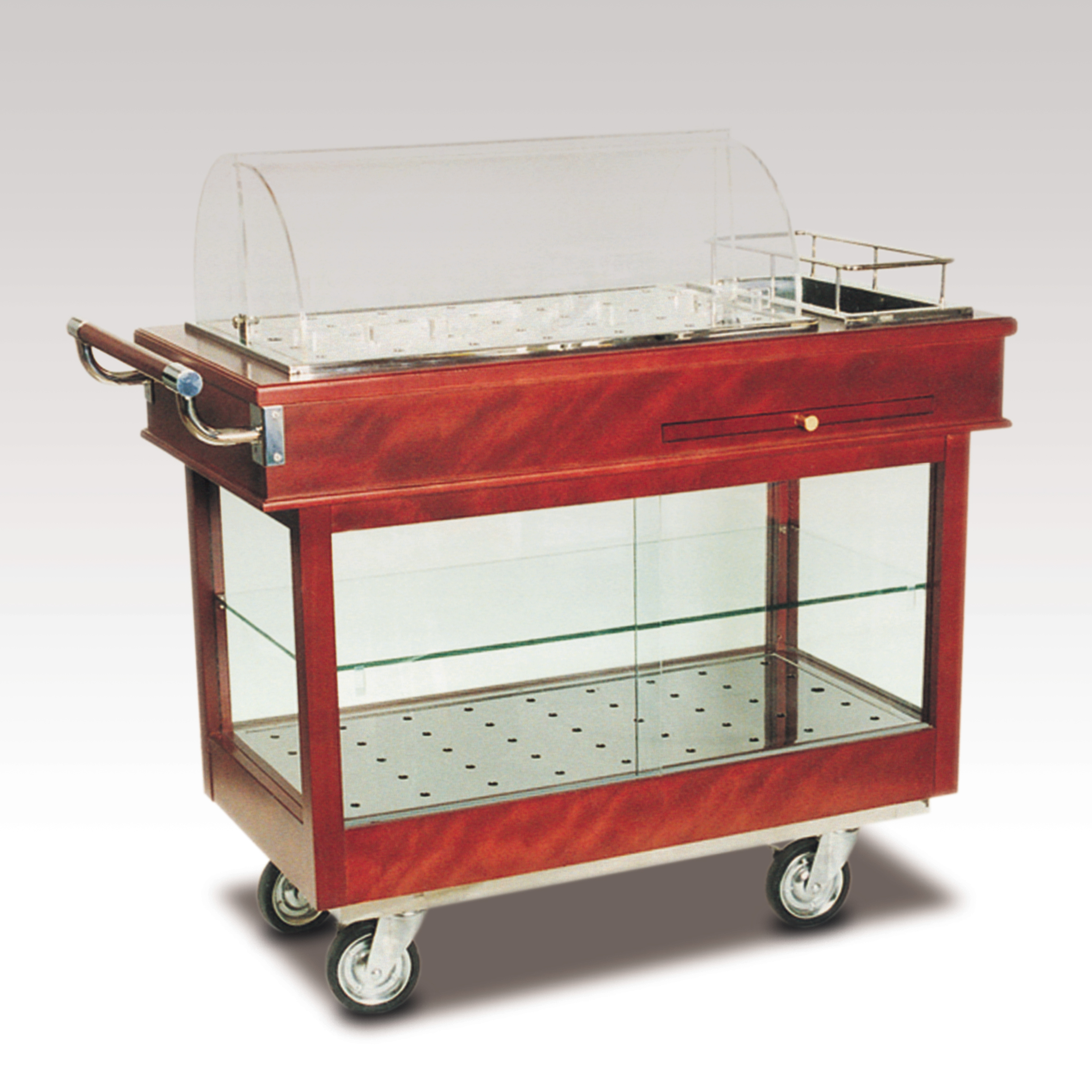 ・サイズ:W1120×D520×H1050mm ・キャスターサイズ:125φ 自在キャスター4輪 ・本体:サクラ材塗装 ・アクリルフード ・販売価格:\585,000 (消費税は別途)