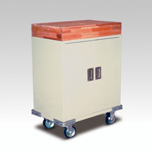 ・サイズ:W810×D500×H900mm ・キャスターサイズ:130φ 自在キャスター2輪 固定キャスター2輪 ・本体:スチール焼付 ラワンボックス付 ・天板:ステンレス ・内部棚板メラミン化粧板 ・販売価格:\205,400 (消費税は別途)