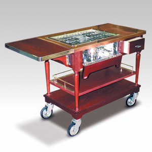 ・サイズ:W1100×D550×H750mm ・キャスターサイズ:125φ 自在キャスター2輪 ストッパー付自在キャスター2輪 ・本体:サクラ材塗装 ・天板:銅板張り ・熱源:アルコールホルダー2個付 ・販売価格:\598,000 (消費税は別途)