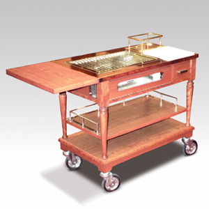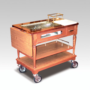 ・サイズ:W1200×D500×H880mm ・キャスターサイズ:125φ 自在キャスター4輪 ・本体:サクラ材塗装 ・天板:銅板張り ・熱源:アルコールホルダー2個付 ・販売価格:\585,000 (消費税は別途)