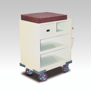 ・サイズ:W850×D500×H920mm ・キャスターサイズ:150φ 自在キャスター2輪 固定キャスター2輪 ・本体:スチール焼付塗装 ・販売価格:\228,000 (消費税は別途)