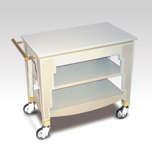 ・サイズ:W880×D450×H720mm ・キャスターサイズ:100φ 自在キャスター4輪 ゴールドメッキ ・本体:ナラ材塗装 ・天板:メラミン化粧板 ・販売価格:\351,000 (消費税は別途)