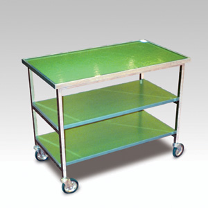・サイズ:W800×D500×H720mm ・キャスターサイズ:100φ 自在キャスター4輪 ・本体:ステンレス ・天板:合板ビニールマット張り ・販売価格:\200,000 (消費税は別途)