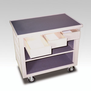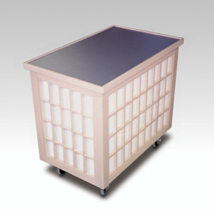 ・サイズ:W800×D450×H750mm ・キャスターサイズ:100φ 自在キャスター4輪 ・本体:タモ材 3面アクリル ・天板:メラミン化粧板 ・引出し3個 ・販売価格:\272,000 (消費税は別途)