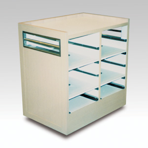 ・サイズ:W875×D610×H950mm ・キャスターサイズ:130φ 自在キャスター2輪 固定キャスター2輪 ・天板/本体:メラミン化粧板 棚板付 ・販売価格:\190,000 (消費税は別途)
