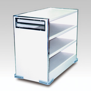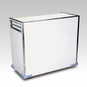 ・サイズ:W960×D550×H990mm ・キャスターサイズ:130φ 自在キャスター2輪 固定キャスター2輪 ・天板/本体:メラミン化粧板 ステンレスエッジ ・販売価格:\221,000 (消費税は別途)