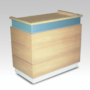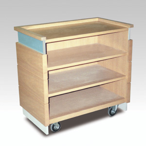 ・サイズ:W980×D550×H950mm ・キャスターサイズ:100φ 自在キャスター2輪 固定キャスター2輪 ・本体:サクラ材塗装 ・天板:メラミン化粧板 ・販売価格:\240,000 (消費税は別途)
