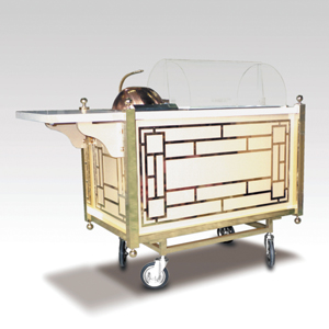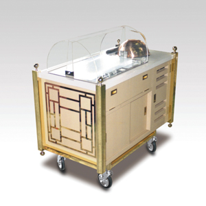 ・サイズ:W1250×D520×H1000mm (W950×D520×H800mm) ・キャスターサイズ:125φ 自在キャスター4輪 ゴールドメッキ ・本体:サクラ材塗装 ・天板:銅板張り ・柱/3面:真鍮飾り ・アクリルフード ・ステンレスボックス付 ・販売価格:\1,222,000 (消費税は別途)