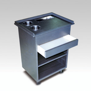 ・サイズ:W500×D400×H700mm ・キャスターサイズ:65φ 自在キャスター4輪 ・本体:ナラ材塗装 ・天板:メラミン化粧板 ・ステンレスポット付 ・販売価格:\247,000 (消費税は別途)