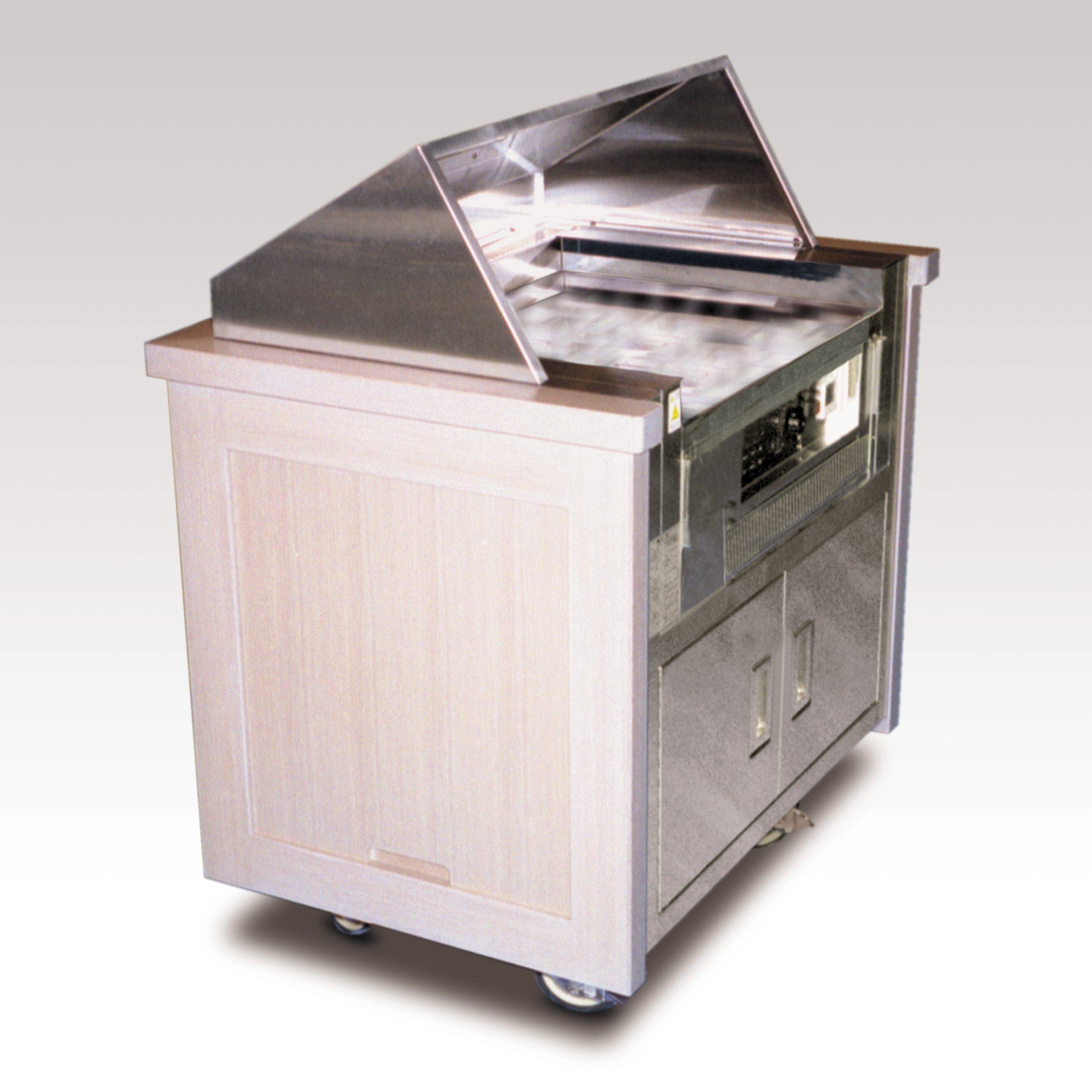 ・サイズ:W900×D600×H1150mm ・キャスターサイズ:130φ 自在キャスター2輪 ストッパー付自在キャスター2輪 ・本体:ナラ材塗装 ・3相200V 3KW ・販売価格:\2,640,000 (消費税は別途)