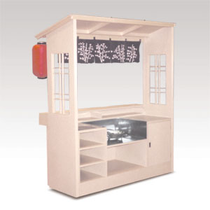 ・サイズ:W1800×D800×H2100mm ・キャスターサイズ:100φ 自在キャスター4輪 ・本体:メラミン化粧板 ・作業台:ステンレス張り ・のれん付 ・ちょうちん付 ・販売価格:\455,000 (消費税は別途)
